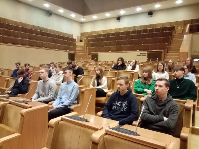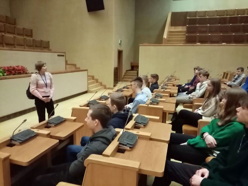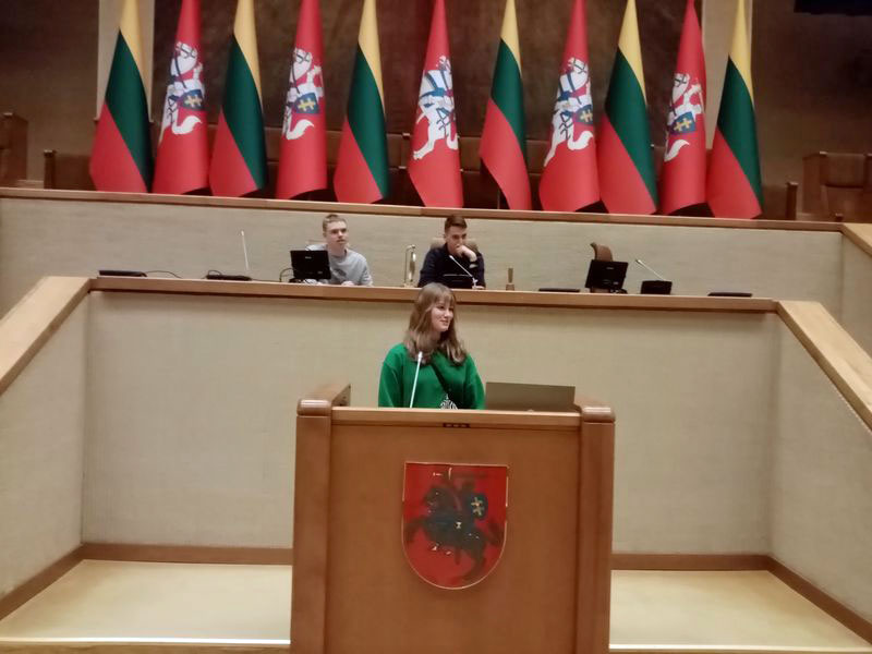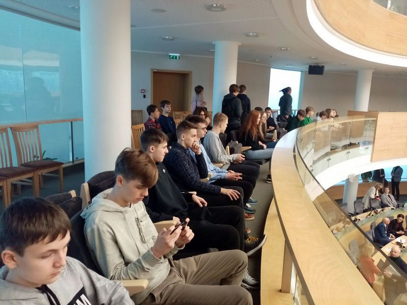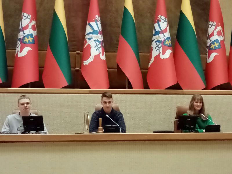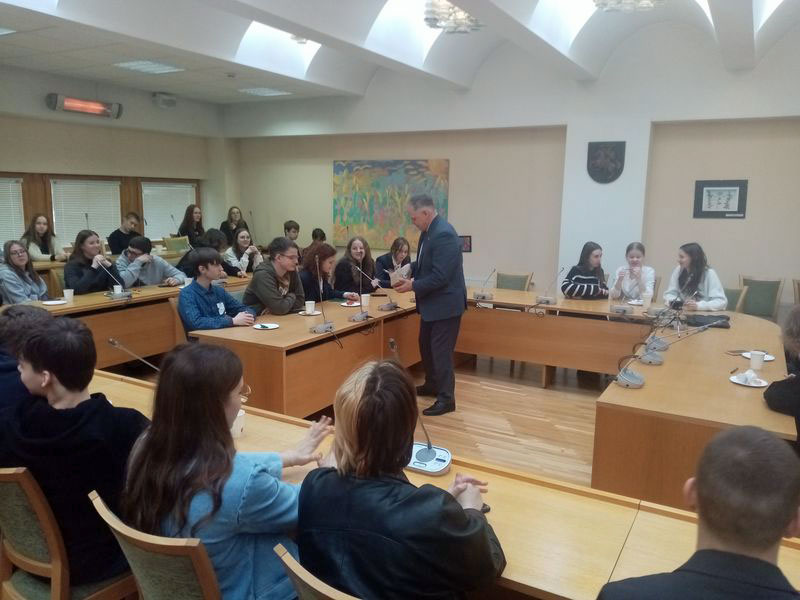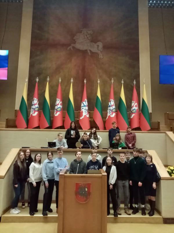 LR Seime šapokiečius pasitiko LR Seimo narys E. Pupinis ir jo patarėjas, buvęs mūsų gimnazijos mokinys – Mindaugas Ramelis. Mokiniams buvo organizuota ekskursija po Seimo Rūmus, kurios metu susipažinta su parlamentarizmo istorija Lietuvoje, įstatymų leidyba, Seimo narių darbu, stebėtas Seimo posėdis. Vėliau Seimo narys E. Pupinis pakvietė gimnazistus pokalbiui prie arbatos puodelio ir saldumynų apie Seimo veiklas, o M. Ramelis papasakojo apie savo studijas, karjerą ir dabartinį darbą.