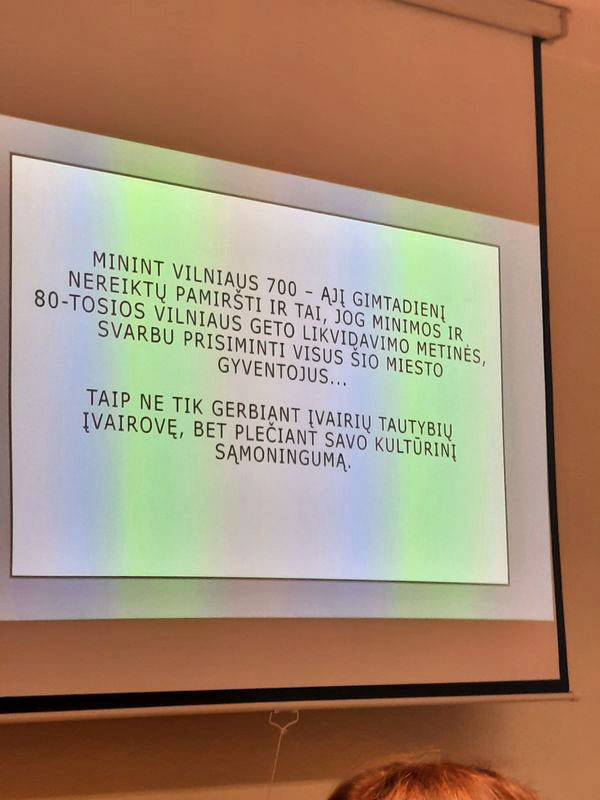 Lapkričio 20 d. pirmokai dalyvavo Vilniaus 700-ųjų gimtadienio metinių minėjimui skirtame projekte, integruotame su Vilniaus geto 80-ųjų sunaikinimo metinių minėjimu „Prisiminimų miestas“, „Vilniaus geto šviesuoliai“. Projekto metu aptarta daugiasluoksnė istorija, menanti žmonių, kultūrų, kalbų, religijų įvairovę. Projekto veiklos vyko pagal Kultūros paso programą. Pamokos vadovė – edukatorė Jurgita Jackevičiūtė.
