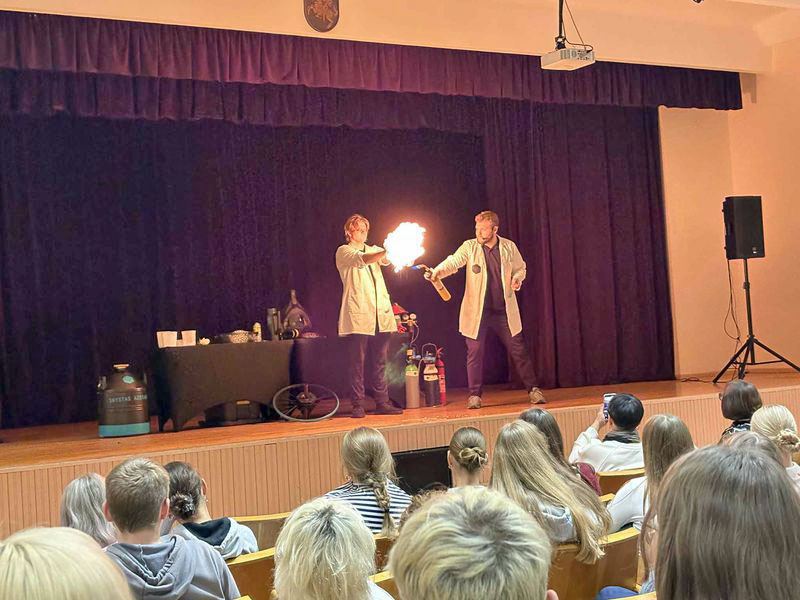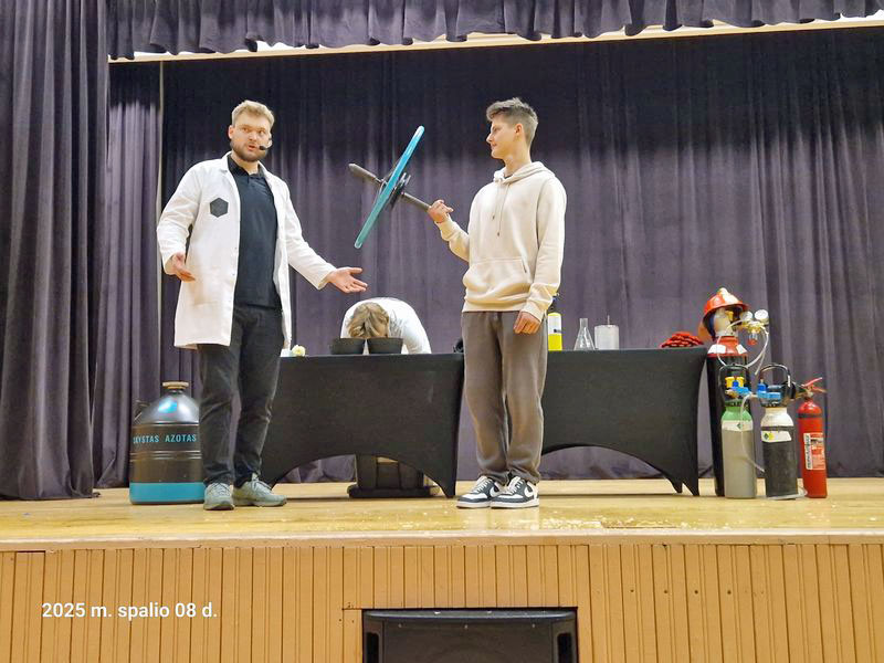Spalio 8 d. į aktų salę rinkosi I–IV klasių mokiniai, pasirinkę STEAM kryptį. Tądien gimnazijoje svečiavosi profesionali N2 komanda, užsiimanti moksline demonstracine veikla. N2 komanda garsėja įspūdingais mokslo šou ir edukacinėmis programomis, kurios skatina jaunimą domėtis gamtos mokslais. Šiame renginyje mokiniai turėjo galimybę stebėti ne tik įdomius eksperimentus, bet ir patirti, kaip mokslas gali būti kupinas netikėtumų bei pramogų.