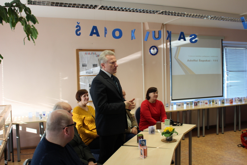 Vasario 8 d. gimnazijoje prasidėjo renginių ciklas, skirtas istoriko Adolfo Šapokos 111-osioms gimimo metinėms paminėti. Bibliotekoje veikia integruoto informacinių technologijų ir pilietiškumo projekto mokinių darbų paroda, kurią organizavo Sandra Rakauskienė, Kristina Levčenkienė, Vida Gudelienė, Daiva Dūdėnienė ir Jolita Baltuškienė. Bibliotekos skaitykloje vyko prisiminimų apie Adolfą Šapoką pamoka, kurioje dalyvavo ir mintimis apie istoriką dalijosi Adolfo Šapokos sūnėnas Algirdas Šapoka iš Šiaulių bei Algirdo Šapokos sesers sūnus, sporto žurnalistas Marius Grinbergas. Savo įspūdžius apie viešnagę Toronte pasakojo mokytoja, Adolfo Šapokos atminimo puoselėtoja Birutė Kairienė bei mokytojas Romualdas Baura, kalbėjo direktorius Saulius Brasiūnas apie buvusį gimnazistą Jaunių Kadūną, šiais metais aplankiusį Adolfo Šapokos kapą Anapilio lietuvių kapinėse, o bibliotekos vedėja Vida Gudelienė pasidžiaugė savo dukters, buvusios šapokietės Rasos Gudelytės kelione į Kanadą aplankant istoriko Adolfo Šapokos kapą bei „Tėviškės žiburių“ redakciją ir atnaujinant kontaktus su šios redakcijos darbuotojais.
